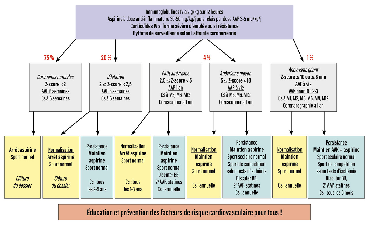 Récemment, des critères de forme sévère d’emblée ont été définis, et leur objectivation impose une prise en charge dans un centre expert pour une intensification thérapeutique d’emblée par IgIV et corticothérapie associée. Ces critères sont : un âge inférieur à 1 an, la présence d’un état de choc (Kawasaki disease shock syndrome), un score de Kobayashi supérieur ou égal à 5 (score prédictif de non-réponse aux IgIV), un syndrome d’activation macrophagique et/ou des anévrismes coronaires et/ou périphériques (fig. 2, encadré jaune ).7