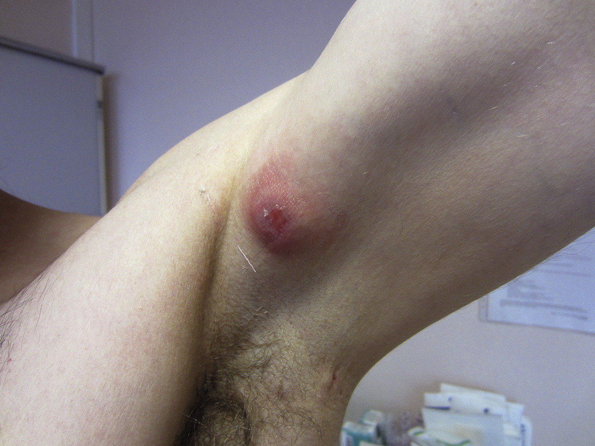 Les lésions précoces sont des nodules douloureux isolés pouvant s’abcéder (fig. 1 ). La répétition de poussées inflammatoires est responsable de cicatrices hypertrophiques et fibreuses en pont, de trajets fistuleux et de comédons ouverts (fig. 2 ). Lésions non typiques : folliculite, bourgeons charnus, cicatrices vermoulues ou à l’emporte-pièce, kystes épidermiques. Pas d’adénopathie ni de fièvre associée.