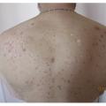 – « folliculaire » ou LC2 (26 %) : touchant les régions axillaires, mammaires, rétro-auriculaires, thoracique, dorsale ; les probabilités de manifestations folliculaires (kystes épidermiques, comédons, sinus pilonidal) sont élevées. Cette forme sévère est plus fréquente chez les fumeurs. Une atteinte pré- et rétro-auriculaire avec des lésions à type de poche et des cicatrices vermoulues du visage doivent faire suspecter le diagnostic ;