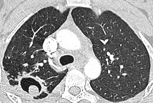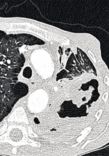 – scanner thoracique compatible montrant une ou plusieurs cavités, avec ou sans balle fongique ou nodules ;