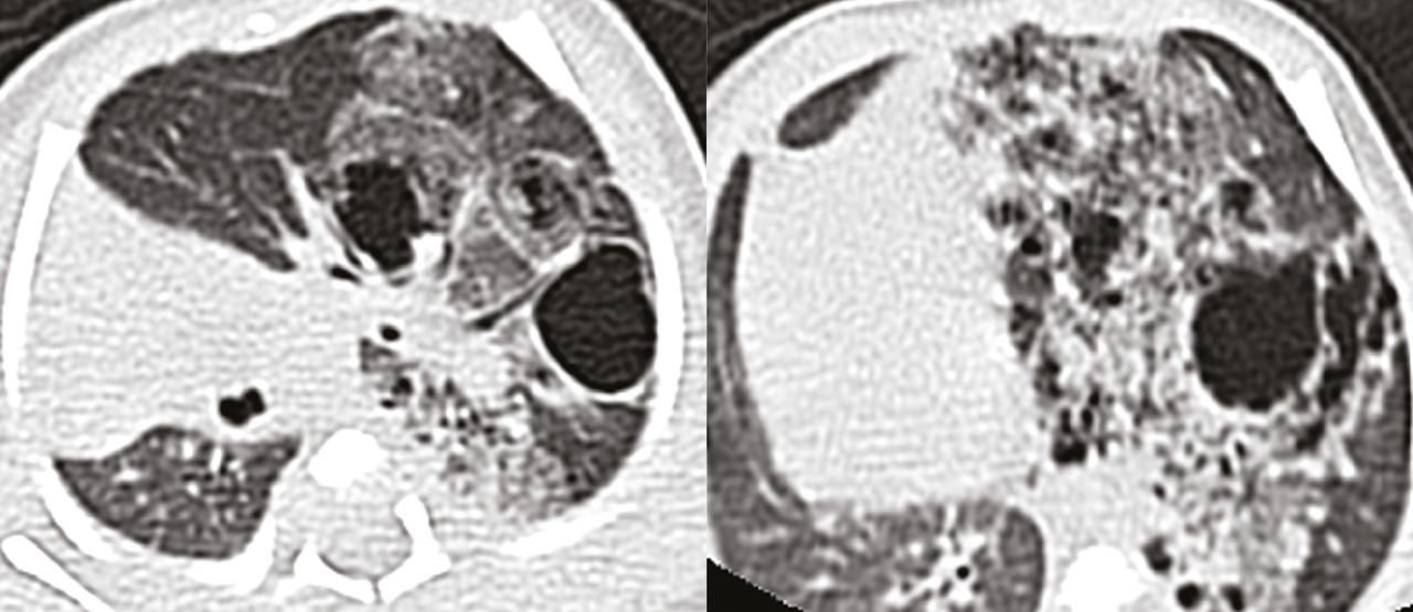 Le diagnostic post-natal est fondé sur le scanner thoracique, qui est l’examen de référence.1 La sémiologie radiologique est variable : une condensation homogène (souvent avant aération des kystes en post-natal immédiat), des images kystiques multiples, l’association d’images kystiques et d’une condensation, un niveau hydroaérique avec épaississement de la paroi des kystes en cas de surinfection. La prédominance lobaire inférieure, unilatérale, est retrouvée dans 98 % des cas.