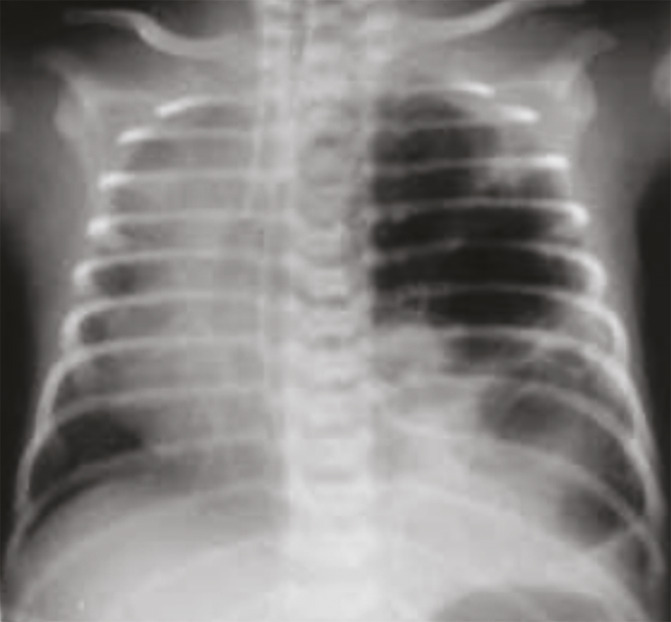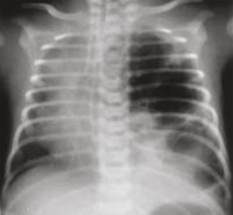 Un nourrisson de 2 mois, de sexe masculin, est admis pour prise en charge d’une détresse respiratoire. La grossesse n’a pas été suivie ; l’accouchement médicalisé s’est déroulé par voie basse. À la naissance, le score d’Apgar est à 2. L’examen clinique à l’admission trouve des extrémités cyanosées, une polypnée (fréquence respiratoire à 80 cycles/min), des signes de lutte (tirage sous- et intercostal, battement des ailes du nez), la saturation est à 60 % en air ambiant, 85 % sous oxygène. L’auscultation thoracique constate une absence de râles et de souffle cardiaque.