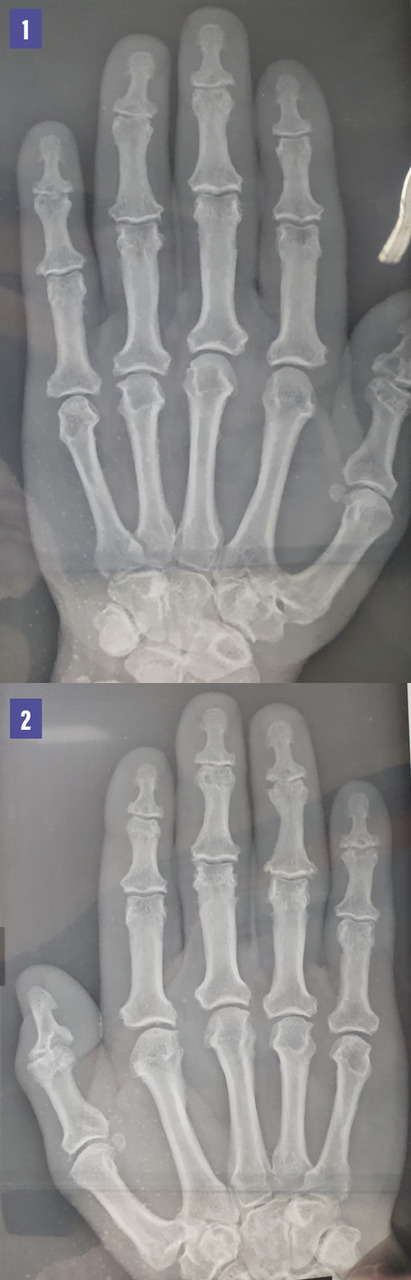 Une femme de 55 ans consulte pour des polyarthralgies périphériques des mains et des pieds d’allure mécanique apparues depuis plusieurs mois. L’examen note une hypertrophie des parties molles, des doigts boudinés, une diminution de la mobilité articulaire des mains et un syndrome dysmorphique crânio-facial non constaté par la patiente (asymétrie légère de la face, base du nez large et épaississement des lèvres). La radiographie des mains montre une hypertrophie de la houppe des phalangettes, la base des phalanges est élargie, avec des ostéophytes réalisant un aspect en ancre de marine des houppes phalangiennes (fig. 1 et 2 ).