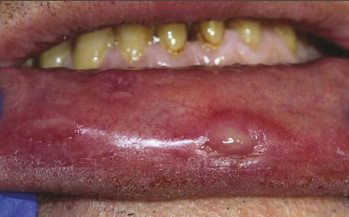 Un homme de 63 ans, fumeur, est adressé pour des plaies buccales douloureuses apparues quinze jours auparavant et associées à une surdité bilatérale de survenue brutale. À l’examen clinique, des ulcérations infracentimétriques sont situées sur le versant muqueux de la lèvre inférieure (