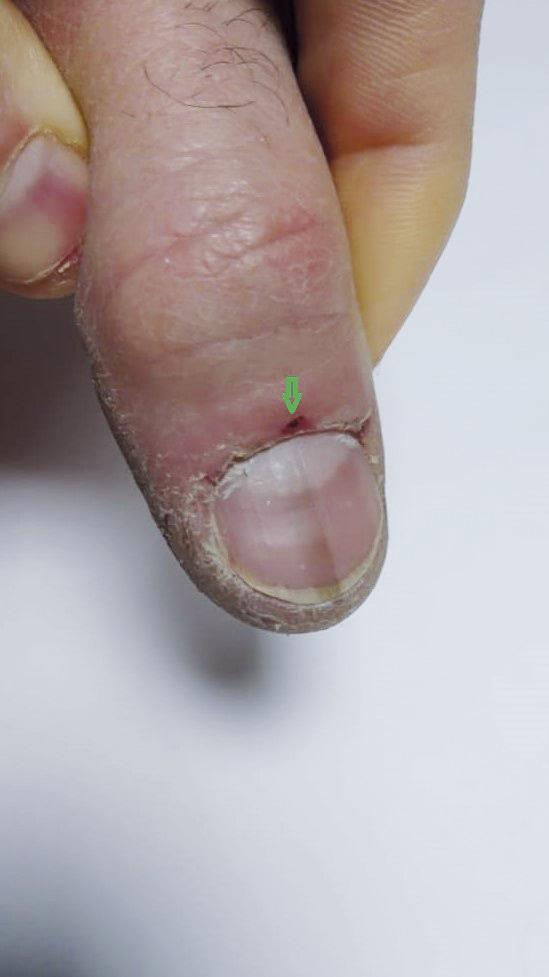 Le traitement est avant tout étiologique (arrêt du traitement inducteur, traitement de l’infection responsable, arrêt ou protection en cas de pathologie professionnelle). La mélanonychie de notre patient est d’origine traumatique, avec une hyperkératose au pourtour de l’ongle, et une plaie au niveau de la région matricielle (flèche verte). Dans ce cas, il faut conseiller une protection des mains. Pour des raisons esthétiques (surtout pour les mélanonychies ethniques), certains patients souhaitent une disparition de cette pigmentation. Il faut savoir qu’un geste chirurgical est efficace pour les formes peu importantes. Pour les grandes mélanonychies, les risques d’onychodystrophie secondaire sont importants.