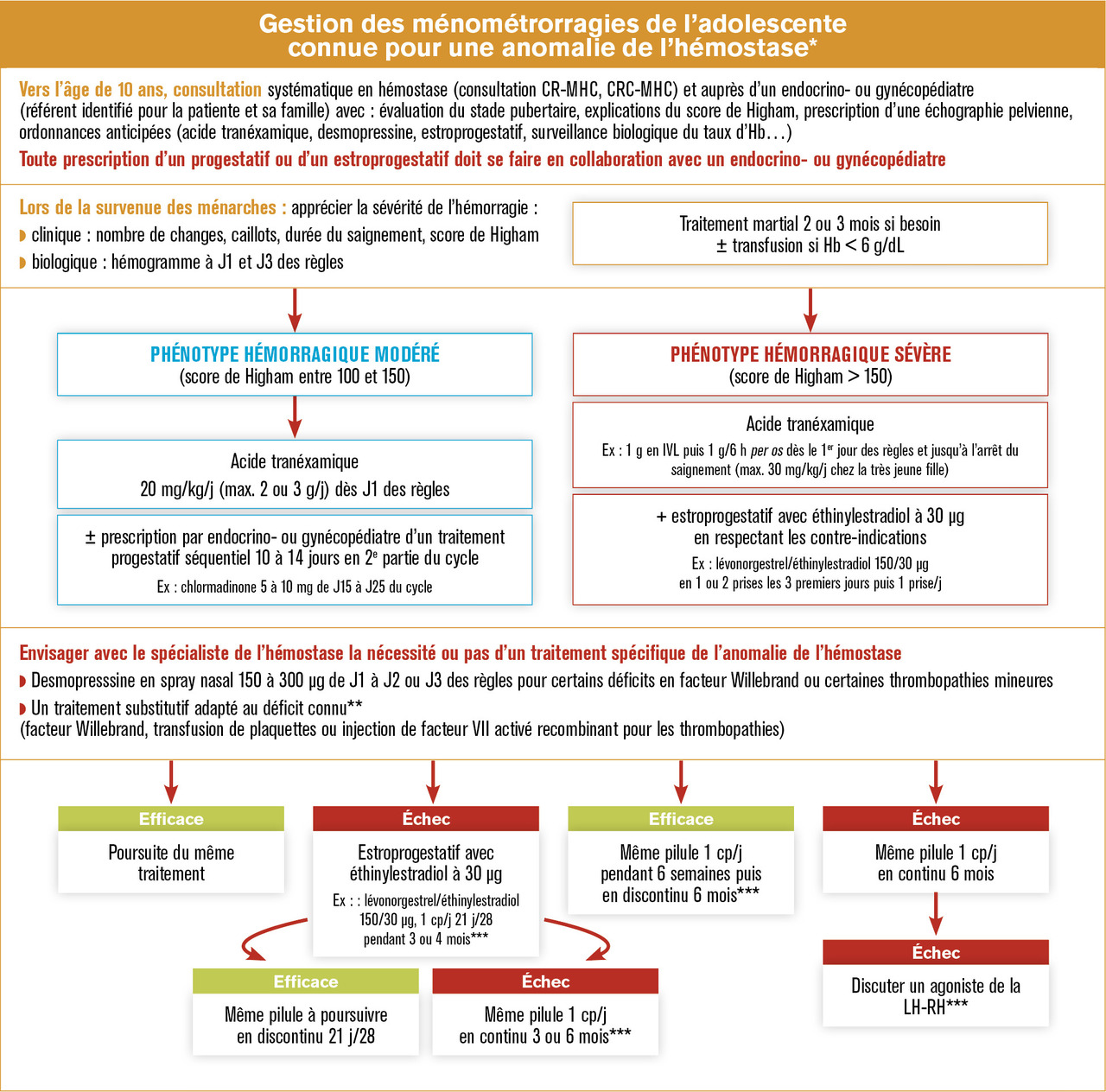 La jeune fille doit en être prévenue, et une consultation dédiée auprès d’un endocrinologue pédiatre ou d’un gynécologue pédiatre est à proposer. Cette consultation a pour objectif de lui expliquer, ainsi qu’à ses parents, le risque de voir apparaître des règles abondantes et la conduite à tenir sur le plan thérapeutique. Le score de Higham est explicité pour pouvoir en faire l’évaluation lors d’une consultation ultérieure. Le recours aux anti-inflammatoires non stéroïdiens a une contre-indication relative dans ce contexte. Leur utilisation en cas de dysménorrhée ne doit pas se faire en première intention et nécessite un avis hématologique. Des ordonnances sont remises : antifibrinolytique (acide tranéxamique) à prendre dès l’apparition des règles si elles sont d’emblée abondantes, prescription d’une pilule, prise en charge spécifique du trouble de l’hémostase quand cela est possible (traitement substitutif par desmopressine, facteur VIII, facteur Willebrand, etc.), et un hémogramme est prescrit afin de dépister l’apparition d’une anémie au 2e jour des règles, si elles sont abondantes. Il est également conseillé de limiter les activités sportives lors des règles.