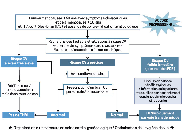 Le traitement hormonal de la ménopause (THM) fait encore l’objet de controverses.13 Les experts du consensus de la Société française d’HTA ont précisé ses indications : voie transdermique, femme de moins de 60 ans, symptômes climatériques invalidants, faible RCV et ménopause datant de moins de 10 ans.