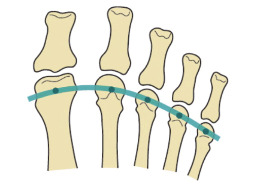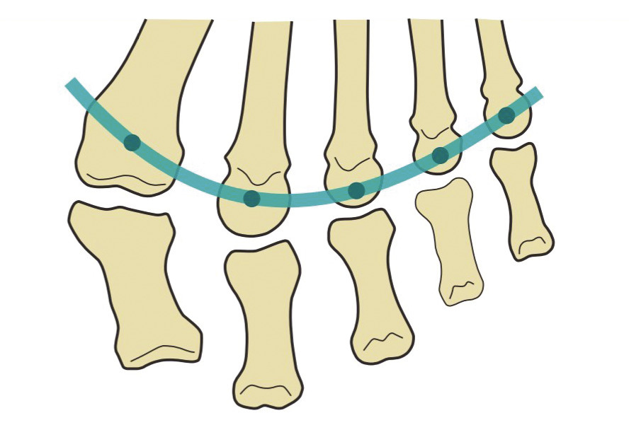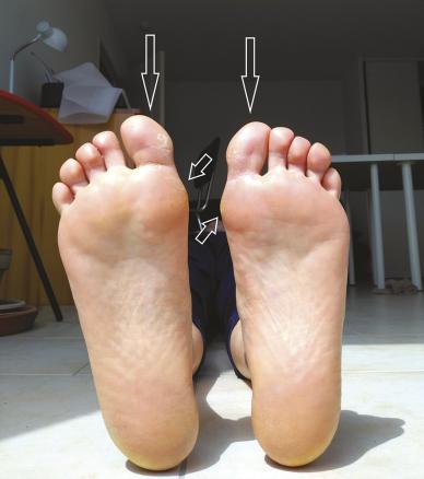 Une jeune femme de 23 ans, militaire, consulte pour des douleurs des avant-pieds à leur face plantaire, majorées à gauche, depuis plus d’un an. À l’inspection, il y a un hallux valgus majoré à gauche et une callosité de cisaillement sur le versant médial du premier métatarsien (fig. 1 ). Il apparaît une cassure de la courbe des têtes métatarsiennes (courbe dite « de Lelièvre »).