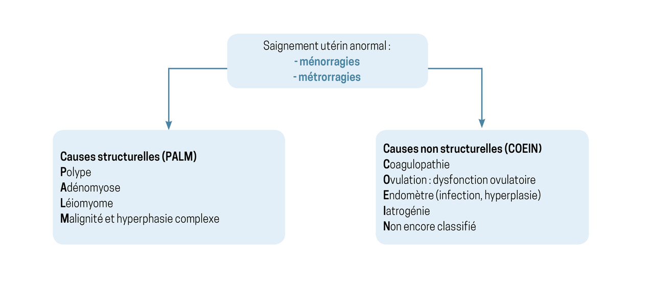 Les causes de saignements utérins anormaux en périménopause sont classées en deux grandes catégories : structurelles (polypes endométriaux, adénomyose, léiomyome, cancer de l’endomètre) ou non structurelles (coagulopathie, dysfonction ovulatoire, hyperplasie endométriale, iatrogénie) [v. figure]. Les métrorragies fonctionnelles par anovulation sont les plus fréquentes, représentant 80 % des cas.