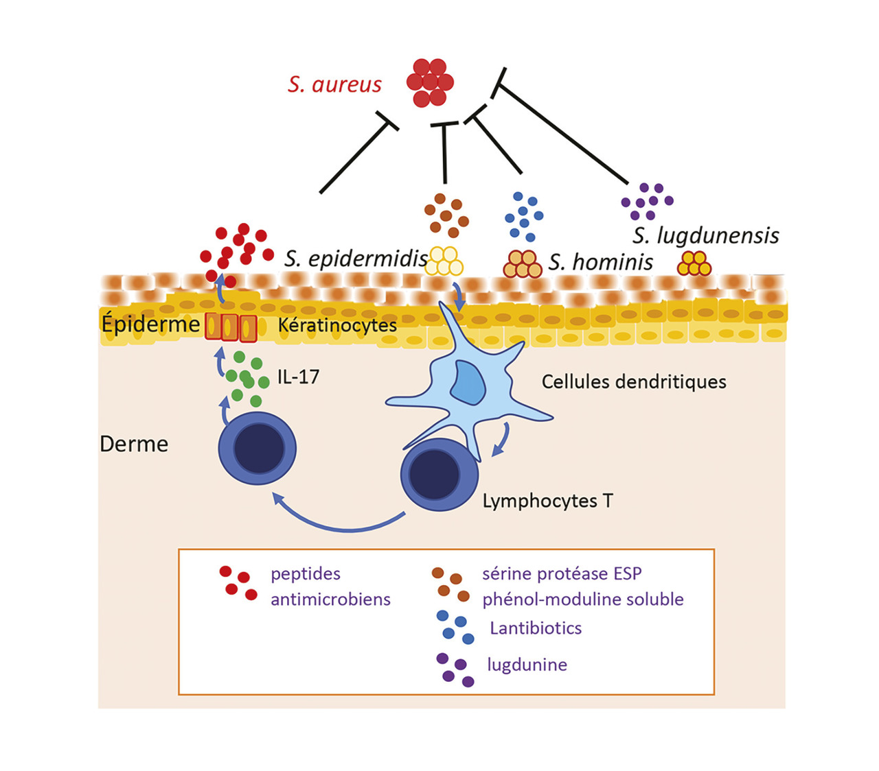 Mais les staphylocoques à coagulase négative peuvent également interagir directement avec le système immunitaire pour activer la production de peptides antimicrobiens par les kératinocytes. L’interaction entre S. epidermidis et les cellules dendritiques dermiques aboutit à une activation lymphocytaire qui produisent de l’interleukine 17, cette dernière activant la production de peptides antimicrobiens par les kératinocytes.5 Les molécules antibiotiques produites par les staphylocoques à coagulase négative agissent de manière synergique avec les peptides antimicrobiens humains.