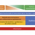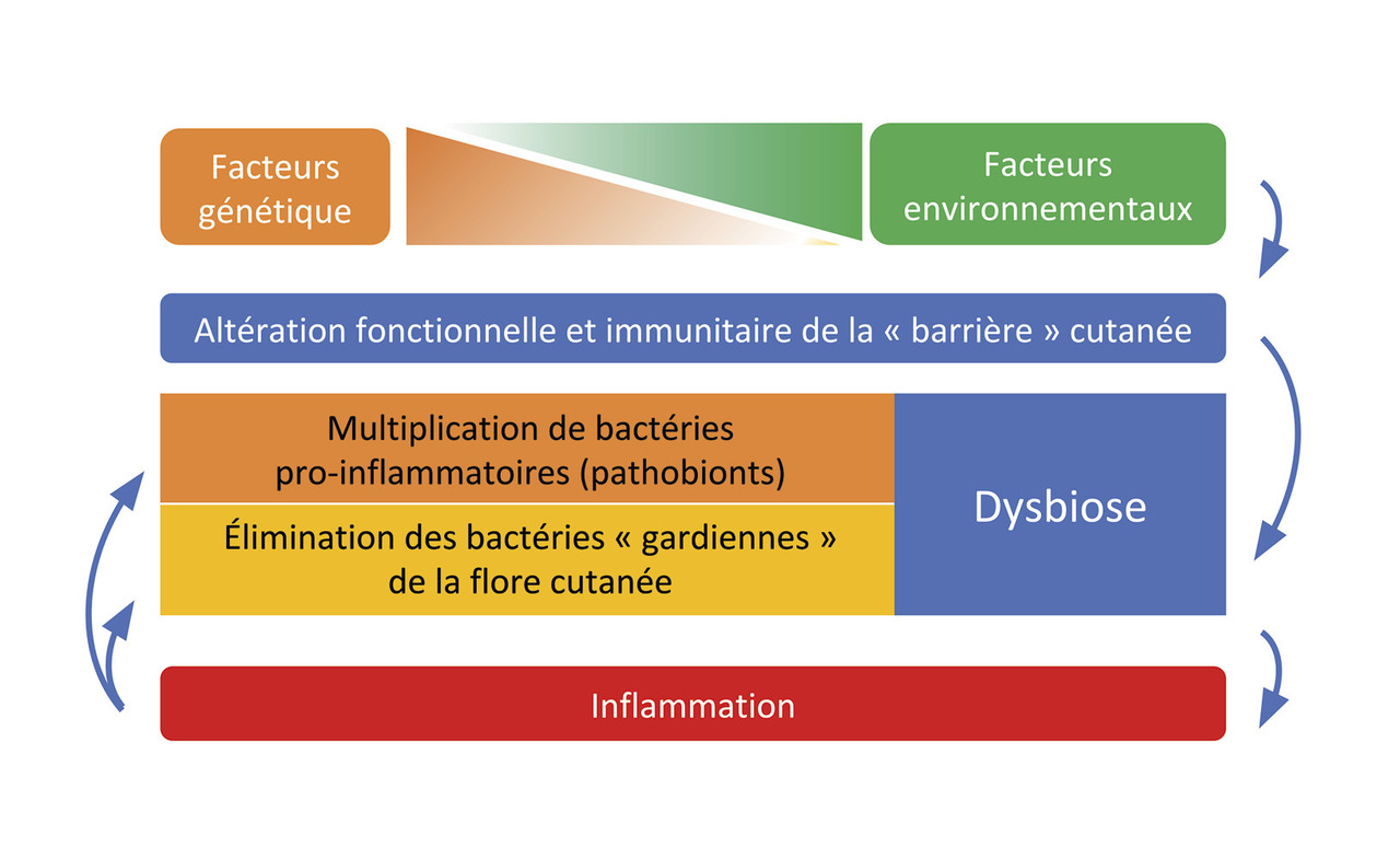 Les données ci-dessus démontrent que la composition du microbiote cutané est contrôlée par l’hôte et qu’il interagit physiologiquement avec le système immunitaire dans le cadre d’une relation mutualiste, bénéfique pour les deux partenaires.6 Les maladies inflammatoires cutanées pourraient donc résulter, chez des sujets génétiquement prédisposés, d’une altération de la composition bactérienne du microbiote cutané ou dysbiose, et/ou d’une altération qualitative du microbiote cutané (