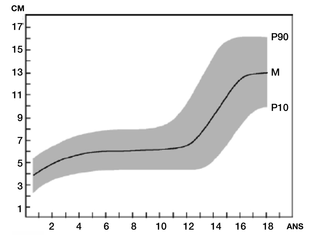 La mesure est faite sur une verge en traction légère (en prenant le gland entre le pouce et l’index et en tirant jusqu’à sentir un début de résistance), en dégageant bien les corps caverneux de la graisse sus-pubienne. Elle est réalisée sur la face dorsale du pénis, de la base à l’extrémité distale du gland dégagé, avec au mieux une règle dure (fig. 1).1 La palpation et la mesure de l’épaisseur permettent d’évaluer sa trophicité et de rechercher une hypoplasie des corps caverneux. On examine le scrotum et les testicules pour en définir la position et la taille. Le micropénis est une verge de taille < 2,5 cm à la naissance (enfant à terme), < 3-3,5 cm à 2-6 ans, < 4 cm à 6-11 ans, < 9 cm à l’âge adulte (1res normes établies par Schonfeld, et al.2 ; fig. 2). Le plus souvent, le patient a un caryotype 46 XY, avec un méat urétral apical, un scrotum normal et des testicules en place ou cryptorchides, de dimension normale ou petite.