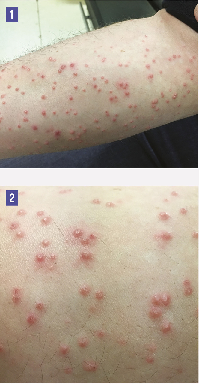 Ce militaire de 30 ans consultait pour une éruption extensive d’évolution lente depuis plusieurs semaines. Initialement au poignet, les lésions atteignaient l’ensemble de l’avant-bras. Il n’existait pas de manifestation associée, ni prurit ni aucune modification environnementale récente, ni cas de punaises de lit dans son entourage. L’examen montrait des papules perlées hémisphériques de couleur rose avec des intervalles de peau saine sans érythème associé (fig. 1 et 2), sans adénopathie satellite. Le patient était adressé en consultation de dermatologie pour avis spécialisé, avec un traitement local par antiseptique. Le dermatologue retenait le diagnostic de molluscum contagiosum, ce qui était confirmé par l’analyse anatomopathologique après biopsie. Un traitement par application topique de Molutrex (hydroxyde de potassium 5 %) permettait la disparition des lésions en quelques semaines.