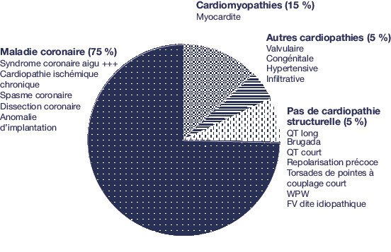 La maladie coronaire est la cause principale de ces arrêts cardiaques (75 %), tandis que les cardiomyopathies et autres cardiopathies structurelles (15-20 %) et les maladies « électriques » (liées aux troubles du rythme cardiaque héréditaire sur cœur structurellement sain) [5-10 %] sont plus rarement en cause (