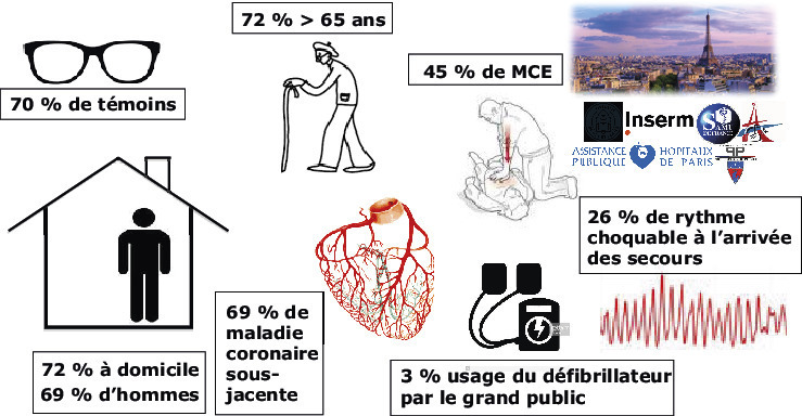 On estime actuellement qu’environ 40 000 arrêts cardiaques extrahospitaliers surviennent chaque année en France. Selon les données du registre francilien mis en place depuis le 15 mai 2011, il s’agit majoritairement d’hommes (69 %), âgés en moyenne de 65 ans ; la survenue se fait principalement à domicile (72%) [