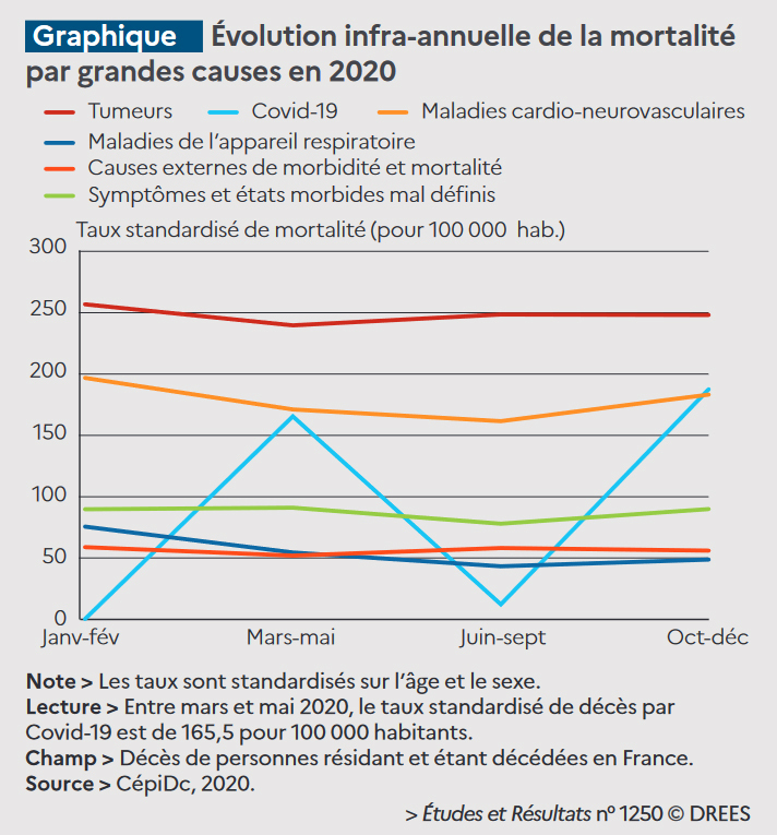 Depuis la fin de la Seconde Guerre mondiale, la mortalité suit une tendance à la baisse générale. Par rapport à 2015-2017, en 2020 le niveau de mortalité rompt avec cette tendance : le taux standardisé de mortalité dépasse de 37 points celui de 2017 en raison de la mortalité liée au Covid, mais la mortalité est plus faible en 2020 qu’en 2017 pour chacune des autres grandes catégories de causes : tumeurs, maladies cardio-neurovasculaires, infections…