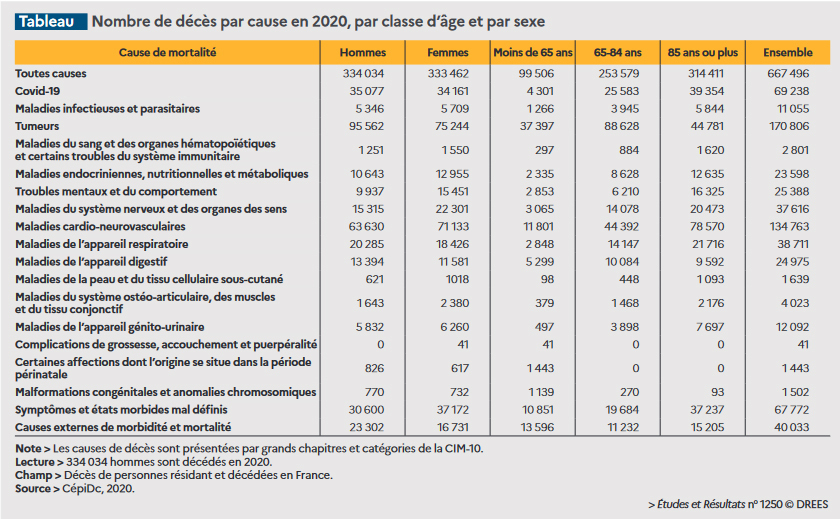 En 2020, 667 496 décès de personnes domiciliées en France ont été enregistrés (tableau) : 10,4 % étaient dus au Covid (69 238). Il s’agit de la 3e cause de décès, derrière les tumeurs (170 806) et les maladies cardio-neurovasculaires (134 763).
