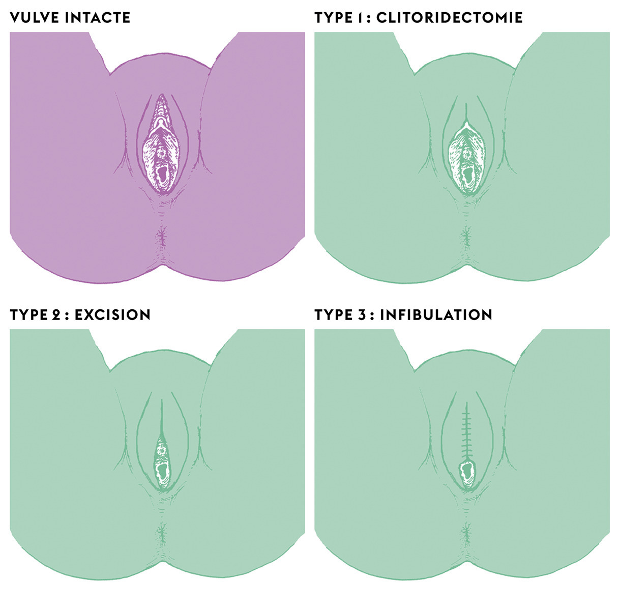 – type 3, l’infibulation, qui est l’ablation du gland clitoridien et des petites lèvres avec suture des grandes lèvres par-dessus ne laissant qu’un passage pour les urines et les menstruations ;