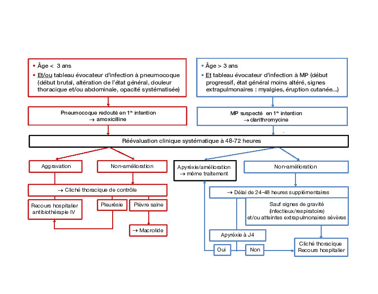 L’Afssaps a précisé en 2005 la démarche thérapeutique face à une pneumonie chez l’enfant (figure ). Avant 3 ans et/ou si le tableau évoque un pneumocoque, l’amoxicilline doit être débutée. Un échec à 48-72 heures doit faire suspecter MP, après avoir écarté une mauvaise observance et/ou une complication (nouveau cliché thoracique). En l’absence de pleurésie, on peut lui substituer un macrolide. À noter que les recommandations anglo-saxonnes ne mentionnent pas d’antibiothérapie probabiliste systématique pour une pneumonie chez l’enfant préscolaire en dehors de signes de gravité, les virus étant alors principalement en cause.