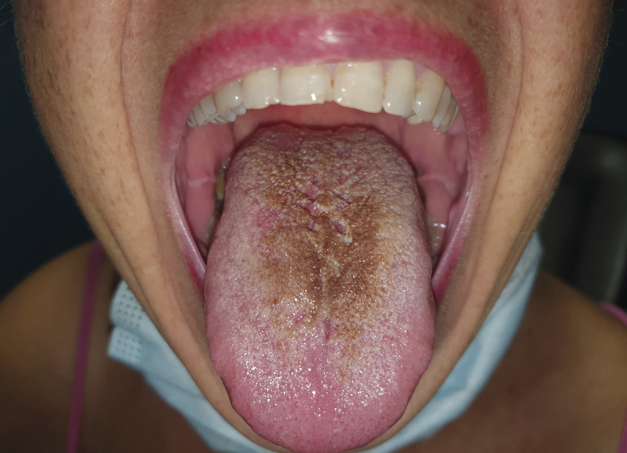 Sur le plan clinique, un enduit de couleur brune est identifiable au niveau du dos de la langue.