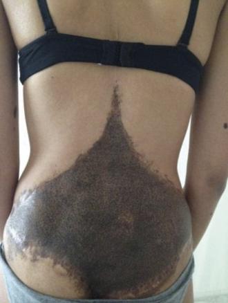 Clotilde, 22 ans, nouvelle patiente, consulte pour la délivrance d’un certificat de non-contre-indication à la pratique sportive. Dans ses antécédents, elle rapporte un nævus congénital géant opéré à plusieurs reprises dans la petite enfance et à l’origine d’une souffrance physique et psychique. L’examen note en effet une lésion cutanée pigmentée de couleur brune de 40 cm de grand axe, située sur l’ensemble de la région lombaire et circonscrite par des cicatrices chirurgicales.