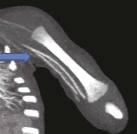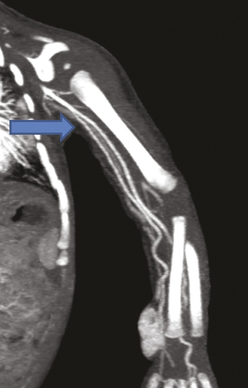 Ce nourrisson de 11 mois était hospitalisé pour l’exploration d’une masse à l’extrémité inférieure de l’avant-bras. À l’échographie, on notait une formation tissulaire hypervasculaire au Doppler couleur, motivant un complément d’investigations. L’imagerie par résonance magnétique étant techniquement difficile à réaliser, un angioscanner a été demandé, qui montrait (fig. 1 et 2 ) une tumeur vasculaire à développement essentiellement sous-cutané respectant les structures musculaires et osseuses. Il mettait en évidence une variante anatomique : une origine haute de l’artère radiale sans cross-over avec l’artère cubitale.