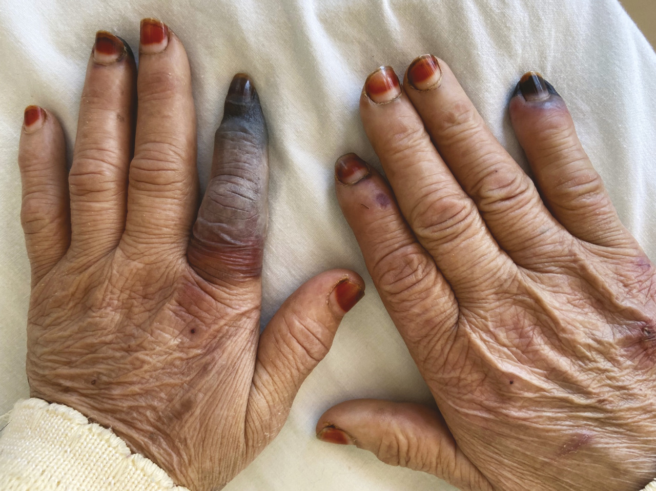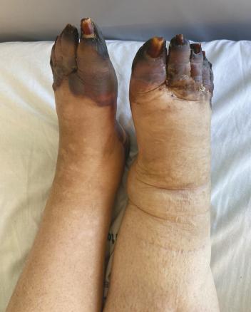 Une patiente de 70 ans, suivie pour une hypertension artérielle, est admise en service de cardiologie pour la prise en charge d’un infarctus du myocarde. Elle a un antécédent de thrombose veineuse profonde traitée. L’examen clinique montre une cyanose des extrémités avec une nécrose des doigts et des orteils (