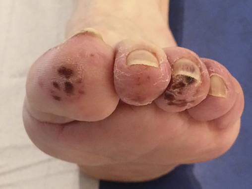 Jacqueline, 83 ans, ayant des antécédents de cardiopathie ischémique, chondrocalcinose, dyslipidémie, consulte pour l’apparition de lésions de couleur brun foncé au niveau de l’extrémité des orteils, responsables de douleurs insomniantes.