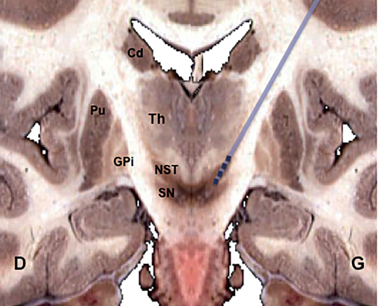 Des études expérimentales chez l’animal ont démontré qu’il était possible « d’exclure » le pallidum interne et certaines zones thalamiques par inhibition électrique à haute fréquence. Dans cette région, selon des essais chez les primates,3 le noyau sous-thalamique (NST) avait déjà paru une cible intéressante pour lutter contre les symptômes moteurs. Cependant, sa lésion définitive provoquant des effets secondaires impressionnants (hémiballisme), il avait été mis de côté. Son retour dans les cibles neurochirurgicales s’est fait grâce à la modulation neuronale réversible (