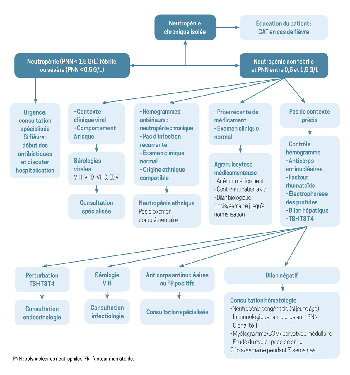 – le caractère isolé ou non de la neutropénie : une bicytopénie ou une pancytopénie nécessitent obligatoirement un avis spécialisé ;