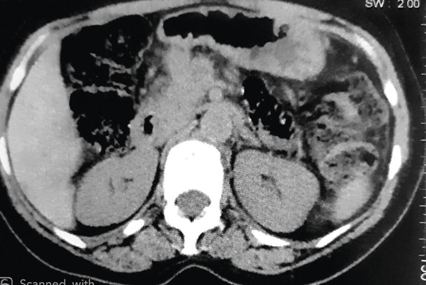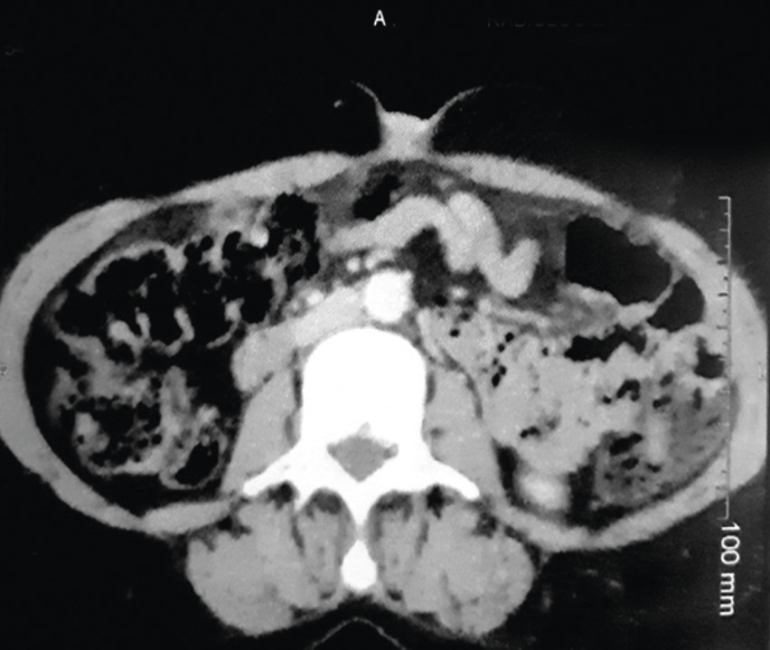 Cette femme de 54 ans consultait pour un nodule ombilical associé à des douleurs de l’hypochondre gauche, et une anorexie depuis 4 mois. À l’examen, cette tuméfaction ombilicale était douloureuse et ferme (fig. 1 ). La tomodensitométrie thoraco-abdomino-pelvienne (fig. 2 et 3 ) montrait un processus tumoral du corps du pancréas avec infiltration de la graisse périlésionnelle, métastases hépatiques et carcinose péritonéale. L’imagerie par résonance magnétique notait un processus tumoral nécrotique du corps du pancréas avec métastases hépatiques et nodules péritonéaux carcinomateux. La biopsie cutanée du nodule montrait une lymphangite carcinomateuse dermique avec des cellules tumorales carcinomateuses en petits amas dans les lymphatiques et un foyer d’infiltration épidermique pagétoïde, concluant à une lymphangite carcinomateuse dermique. Ce nodule dit de Sœur Marie-Josèphe révélait un adénocarcinome pancréatique. La patiente décédait 3 mois plus tard.