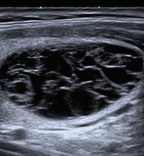 Figure : Nodule spongiforme. Échographie en coupes longitudinale et transversale d’un nodule EU-TIRADS 2. Extrait de : Russ G. Prise en charge du nodule thyroïdien. Rev Prat 2017;67(6);663-7