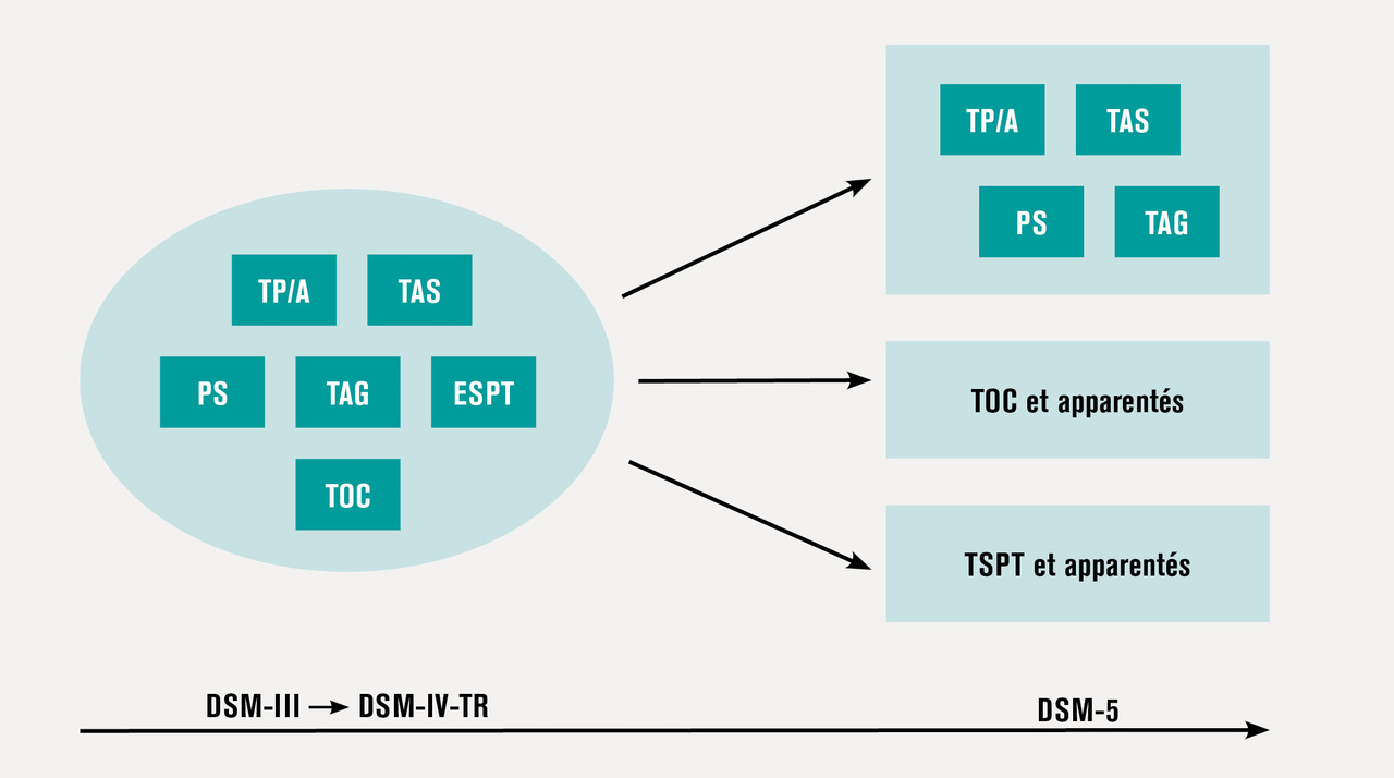 La version actuelle du DSM a sorti le trouble de stress post-traumatique des troubles anxieux, et leur consacre un chapitre entièrement séparé. Cette distinction permet de souligner la spécificité de ce trouble qui se voit associé à une expérience traumatique dont la définition même fut sujet à controverses. Alors que le DSM-IV qualifiait le psychotraumatisme sur la base de caractéristiques à la fois « objectives » (exposition à la mort, à une blessure grave ou à une atteinte à l’intégrité physique) et « subjectives » (sentiment de menace, de peur, d’horreur ou d’impuissance), le DSM-5 supprime ce dernier critère de subjectivité devant le caractère faiblement prédictif d’évolution vers un trouble de stress post-traumatique. La nature psychotraumatique de l’événement est néanmoins étendue aux sujets témoins directs ou indirects via des proches, ou encore exposés de manière répétée ou extrême à certaines caractéristiques de l’événement traumatique.