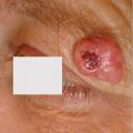 Les patients GO ont un risque multiplié par 100 de développer un CEC. L’aspect clinique du CEC est celui d’une lésion kératosique infiltrée, parfois douloureuse, qui peut fréquemment prendre un aspect trompeur, imposant une biopsie au moindre doute. Certains CEC ont une évolution très rapide, nécessitant une prise en charge chirurgicale urgente. Leur pronostic semble plus péjoratif que dans la population générale. Le risque de développer un CBC est multiplié par 10 chez les patients GO. L’aspect du CBC est celui d’une lésion perlée. Son pronostic est le même que dans la population générale. Le risque de développer un mélanome est multiplié par 2 à 5 chez le patient GO. L’aspect est celui d’une lésion pigmentée atypique. Son pronostic semble plus péjoratif que dans la population générale, notamment pour les mélanomes de stade avancé. Le suivi dermatologique du patient GO doit être au minimum annuel et plus rapproché en cas de survenue de carcinomes ou mélanomes.