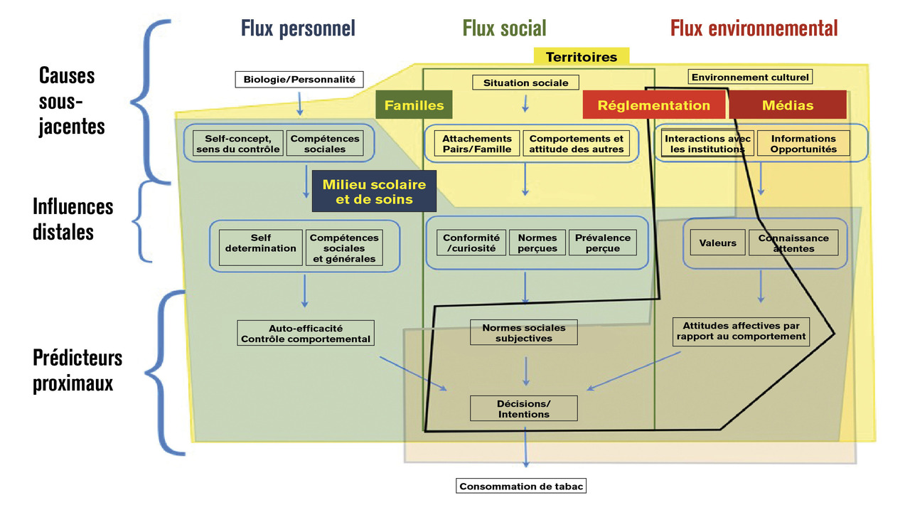 Les auteurs proposent un schéma théorique intégrateur11 sur lequel ils ont superposé la nomenclature des actions de prévention (figure ).12