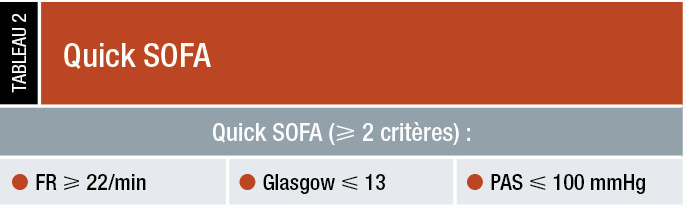 Afin de dépister rapidement les patients ayant un sepsis, un score simplifié (tableau 2) a été créé (quick SOFA), comprenant : pression artérielle systolique inférieure ou égale à 100 mmHg, fréquence respiratoire supérieure ou égale à 22/min et score de Glasgow inférieur ou égal à 13. La présence d’au moins deux critères sur trois justifie une surveillance accrue et/ou un traitement spécifique et/ou un avis en réanimation.