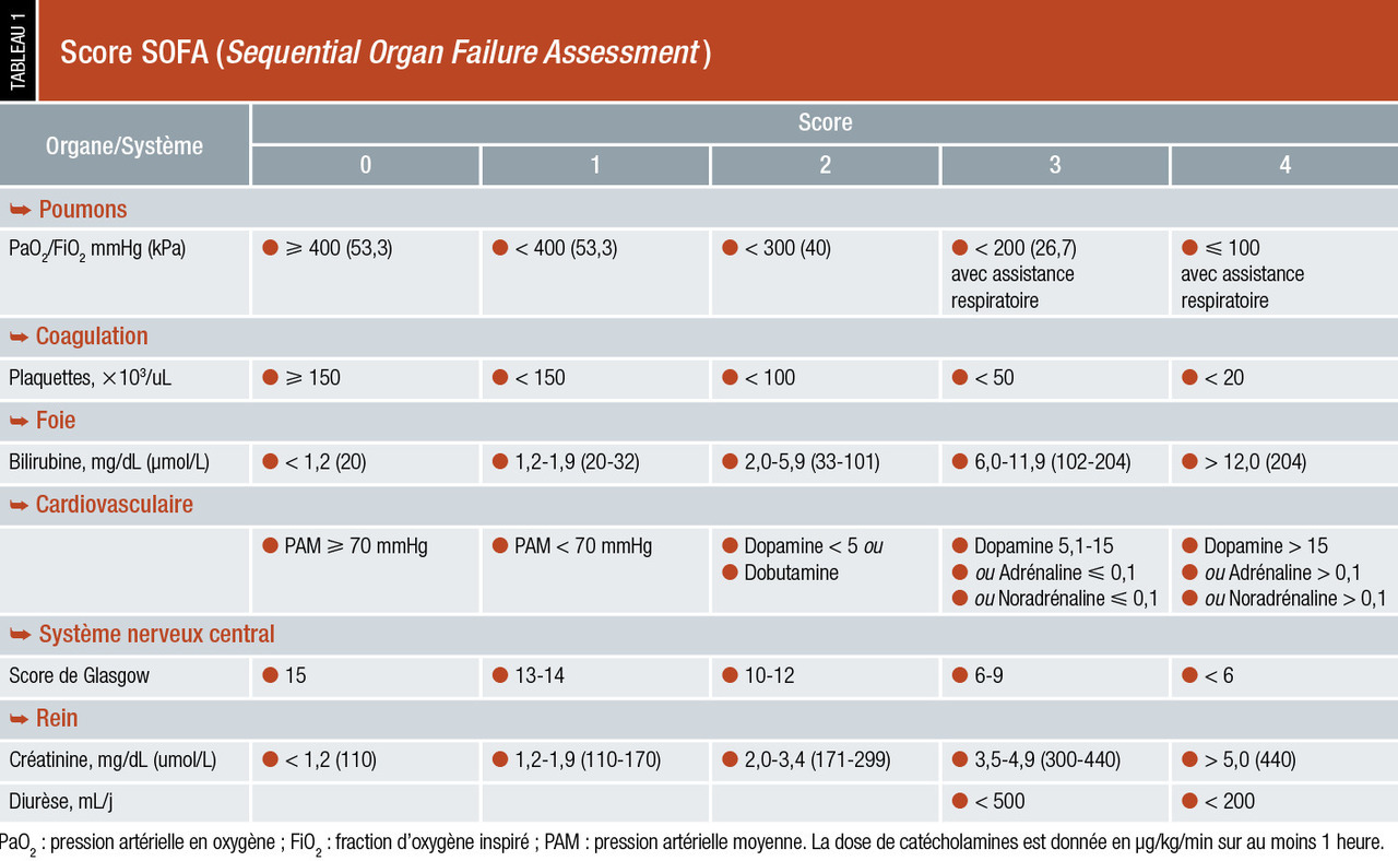 En pratique, le sepsis est défini par un score SOFA supérieur ou égal à 2 (tableau 1) ou une augmentation supérieure ou égale à 2 points si une dysfonction d’organe est présente avant l’infection.