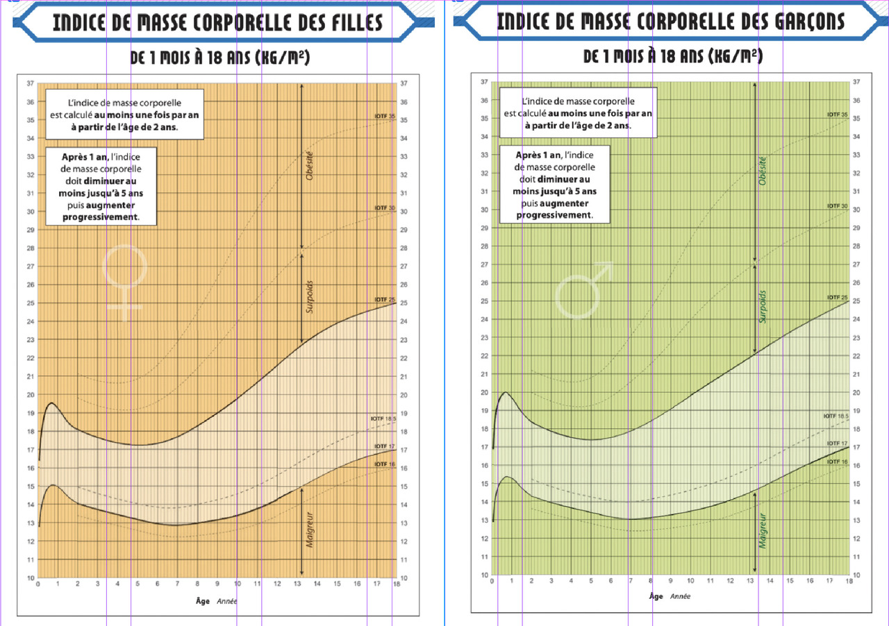 En pédiatrie, la courbe de l’International Obesity Task Force (IOTF), présente dans les carnets de santé français depuis 2018 (fig. 1), permet de repérer un excès de poids chez l’enfant, défini par un IMC > à la courbe IOTF25 (équivalent du 97e percentile pour l’âge et le sexe) avec deux degrés de surcharge pondérale en fonction de la courbe IOTF30 :