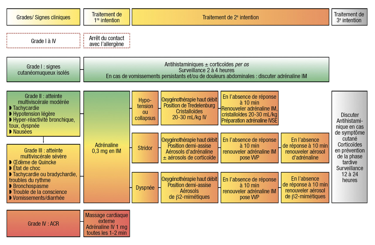 Les recommandations européennes et françaises proposent un algorithme de traitement de l’anaphylaxie identique pour l’enfant et l’adulte.[17, 23] La