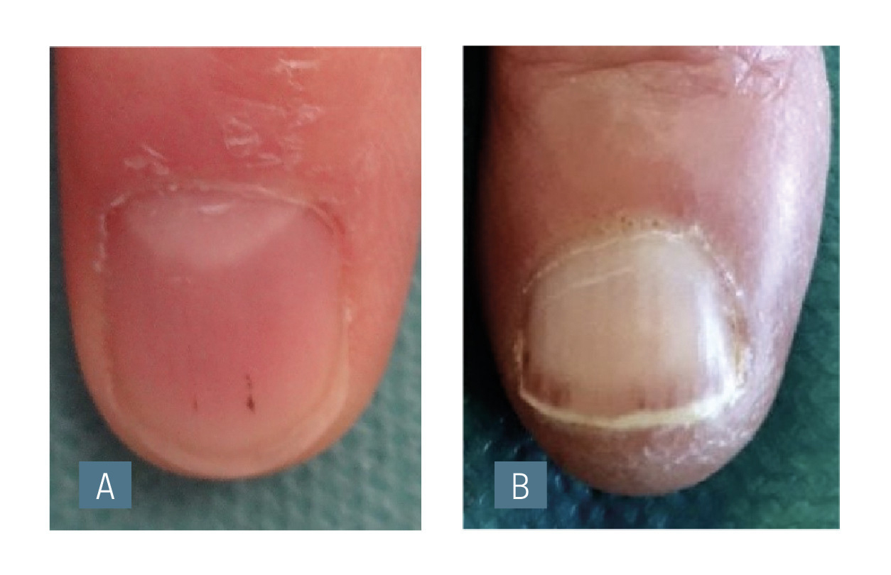 Elles sont symptomatiques d’une pathologie sous-jacente lorsqu’elles sont récentes, nombreuses, pourpres, larges et étendues à la partie proximale de l’ongle (fig. 5B). Un examen complet et des analyses biologiques s’imposent afin d’éliminer ses causes possibles : endocardites, vascularites, hémopathies, troubles de l’hémostase, syndromes hyperéosinophiliques et microthrombotiques.
