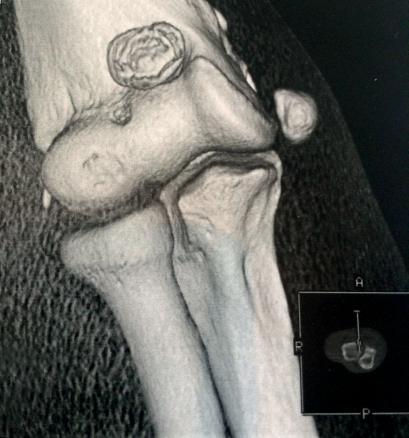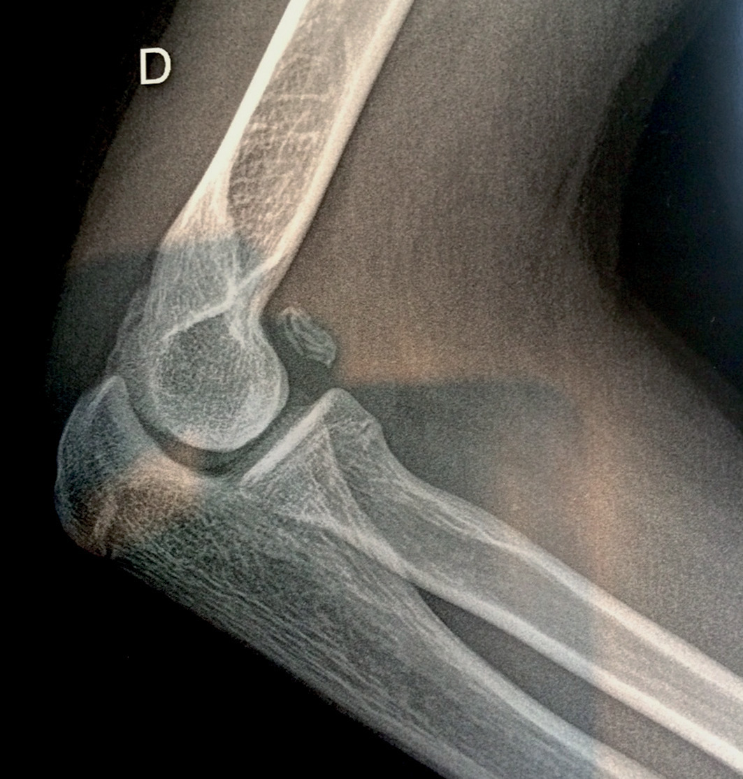 Bastien, 16 ans, se plaint de douleurs du coude droit majorées par l’extension forcée. Non soulagé par les anti-inflammatoires, l’adolescent ressent depuis peu un blocage, l’extension complète est impossible.