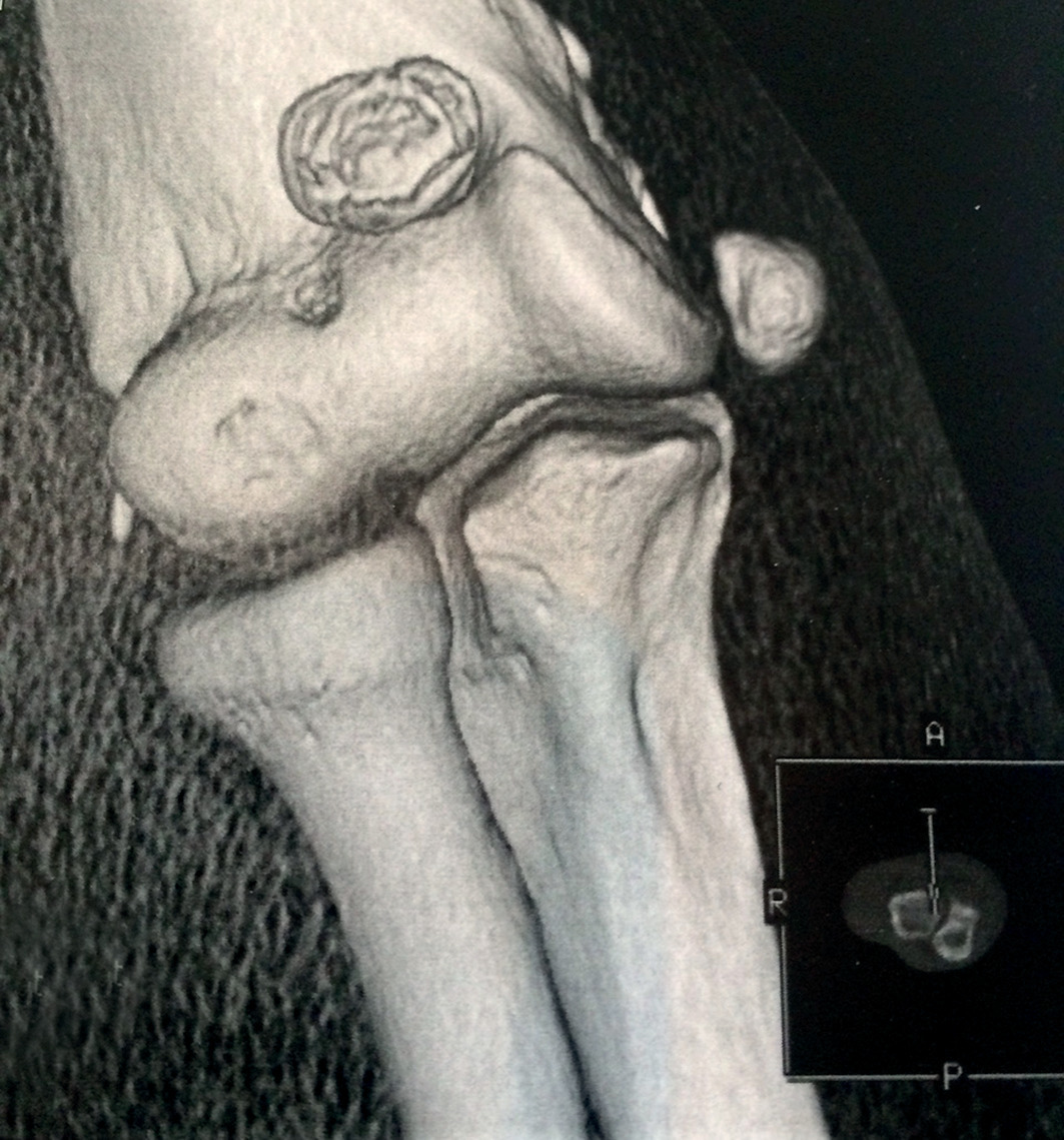 À la radiographie (fig. 1 ), une image calcifiée intra-articulaire évoque un ostéochondrome. Après scanner (fig. 2 ), l’exérèse permet la récupération totale de la mobilité articulaire. L’anatomopathologie confirme l’ostéochondrome bénin.