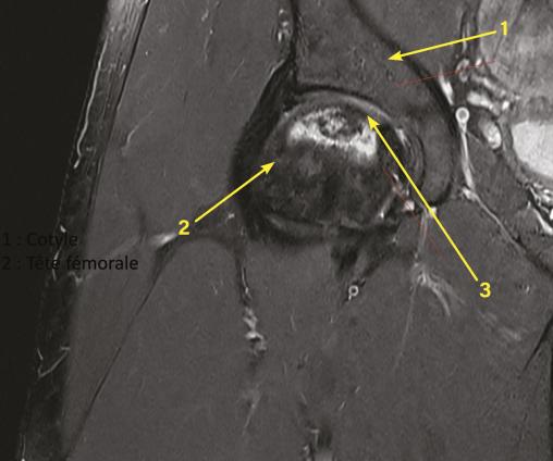 L’IRM retrouve un aspect d’ostéonécrose de la tête fémorale sans déformation de celle-ci.