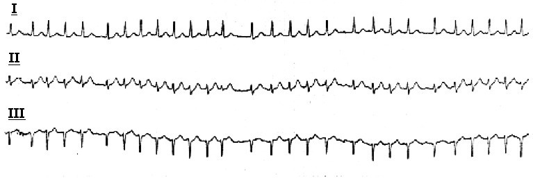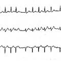Un rythme rapide et régulier avec un début et une fin brusques sont typiques d’une tachycardie de Bouveret (jonctionnelle,fig. 3 ). Fréquence de l’ordre de 170 à 200 batt/min. Elle touche surtout les personnes jeunes qui la vivent plus ou moins bien. Elle est suivie d’une asthénie intense. Le patient connaît parfois une méthode d’arrêt qui donne un stimulus vagal : manœuvre de Valsalva, verre d’eau, compression carotidienne ou pression sur les globes oculaires.