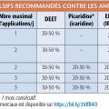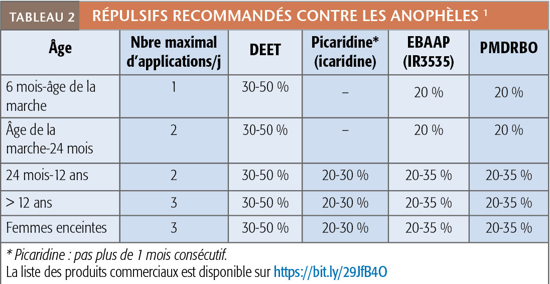 La PPAV qui, pour le paludisme, n’a de sens que la nuit (et plutôt tard dans la soirée), du fait de l’activité essentiellement nocturne des anophèles femelles – seules transmettrices des plasmodies – repose sur : moustiquaire pour dormir, répulsifs cutanés et imprégnation des vêtements. La moustiquaire, surtout imbibée d’insecticides (barrière chimique et mécanique), est le moyen de loin le plus efficace, sa limite résidant dans la contrainte liée à son transport et son installation. L’application de répulsifs est en pratique la stratégie la plus utilisée. Leur efficacité dépend du produit actif et de sa concentration. Ils sont appliqués sur les parties exposées aux piqûres, 1 ou 2 fois selon la durée de la soirée (l’effet dure en moyenne 6 heures mais il y a de grandes variations d’une personne à l’autre). Leur toxicité est faible mais des restrictions s’appliquent chez l’enfant et la femme enceinte (tableau 2). Imprégner les vêtements est un moyen sous-utilisé et pourtant intéressant, en complément des répulsifs. Si c’est fait par trempage, l’effet persiste jusqu’à 5 lavages (2 si pulvérisation), ce qui permet une préparation avant le départ.
