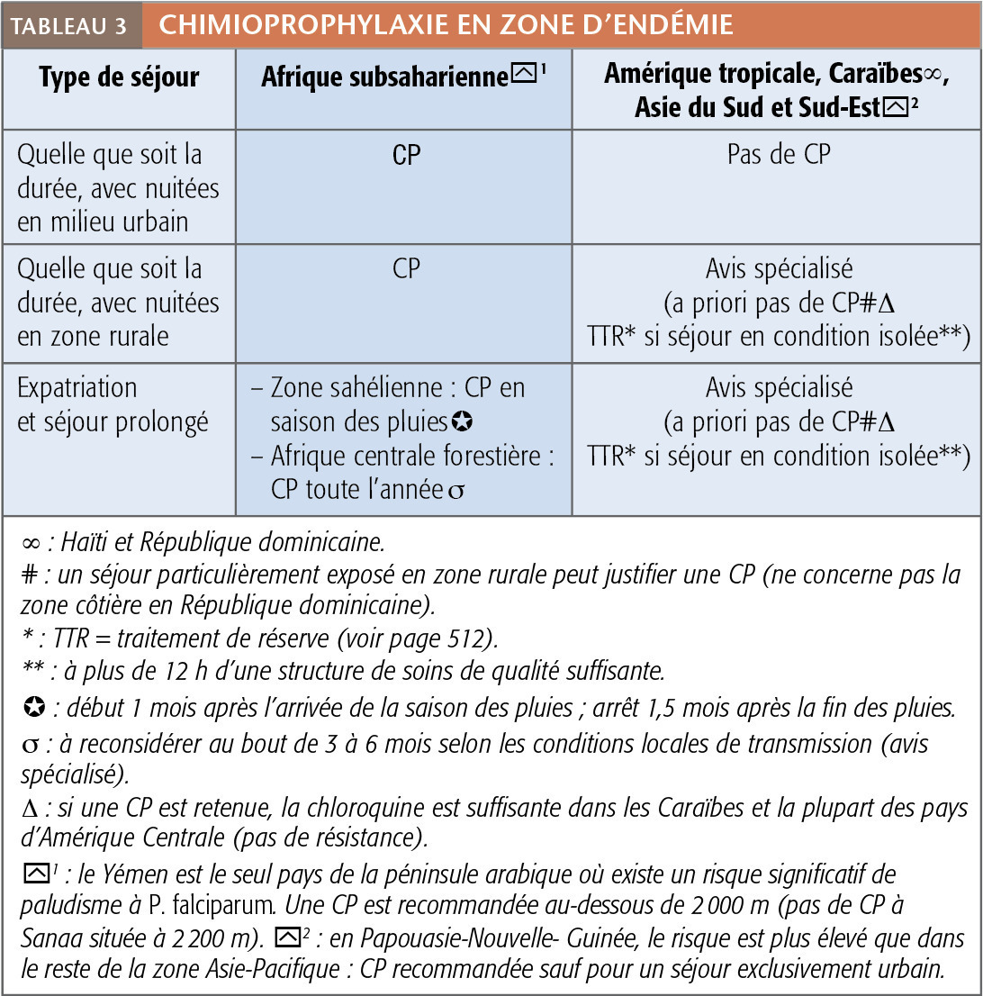 La chimioprophylaxie n’a pratiquement plus d’indications hors Afrique subsaharienne, notamment en Asie et Amérique tropicales (tableau 3). Outre le fait que la majorité des paludismes à P. falciparum surviennent lors de séjours de plus de 1 mois, dans ces 2 continents le risque est 1 000 fois plus faible (par rapport à l’Afrique subsaharienne) et P. falciparum n’est pas trans- mis en zone urbaine. Ainsi, un séjour avec la totalité ou l’essentiel des nuitées en ville (quelques nuitées en zone rurale ne remet pas en cause l’abstention) ne justifie pas de CP, a fortiori s’il est court (majorité des voyages dits « conventionnels ») car la balance bénéfice- risque ne serait pas favorable. Dans des conditions d’isolement (trek…), un traitement de réserve (ou présomptif d’urgence) qui consiste à prendre une thérapie curative de 1re ligne en cas de fièvre et impossibilité d’avoir un diagnostic fiable dans les 12 heures, peut se discuter, idéalement après avis spécialisé.