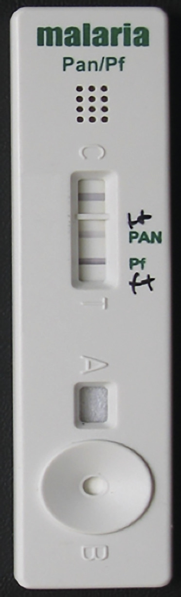 Les TDR (fig. 2 ), dont les performances sont désormais équivalentes à celle d’un frottis, ont l’avantage de ne pas être opérateur-dépendants. Ainsi, dans les laboratoires non spécialisés, qui ne disposent pas toujours de l’expertise nécessaire pour réaliser et interpréter l’examen direct, on peut « débrouiller » le diagnostic par un TDR en l’associant à un frottis sanguin. Plusieurs techniques étant disponibles, ces tests doivent obligatoirement détecter la protéine HRP2, spécifique de P. falciparum. Le diagnostic étant une urgence (chaque heure compte, a fortiori dans les formes graves), le laboratoire doit être en mesure de rendre le résultat au praticien dans les 2 heures suivant l’arrivée du tube. Si positif, il doit être obligatoirement communiqué directement (traçabilité recommandée).