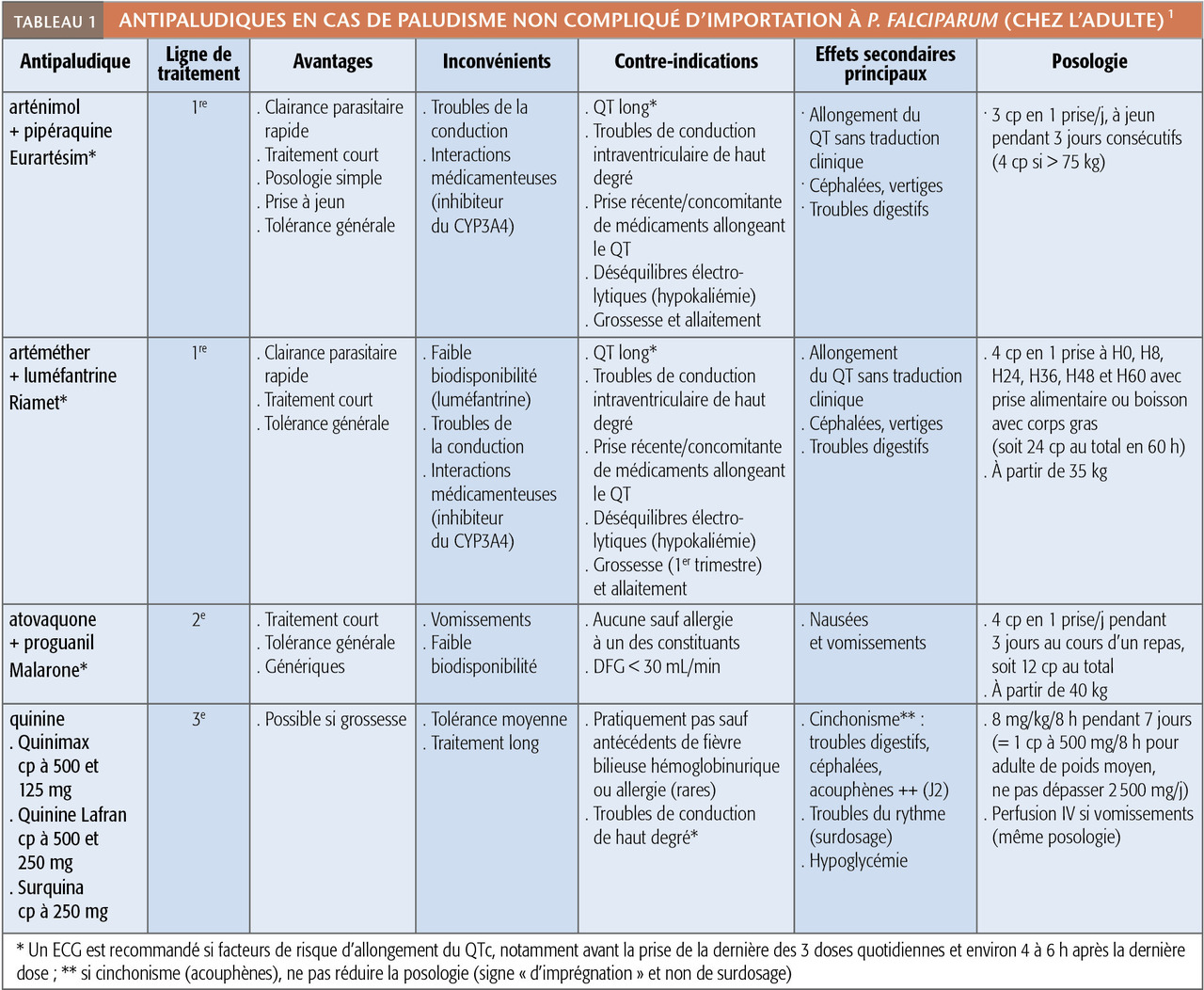 En l’absence de signe de gravité (accès palustre simple ou non compliqué), les bithérapies incluant un dérivé de l’artémisinine (artemisinin-based combination therapy ou ACT) sont devenues la référence. Deux produits sont disponibles en France : l’arténimol-pipéraquine (Eurartesim) et l’arté- méther-luméfantrine (Riamet). Ils ont des profils d’efficacité et de tolérance comparables (tableau 1) même si le premier a l’avantage d’une posologie plus simple et peut être pris à jeun (nausées et vomissements fréquents dans le paludisme) ; ils partagent les mêmes contre-indications cardiaques (risque d’allongement de l’espace QTc).