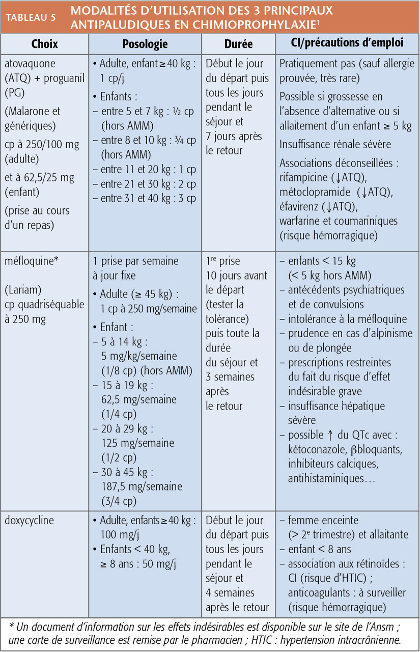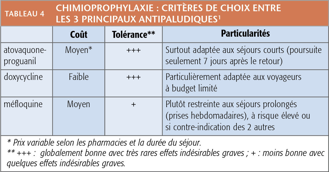 Les indications de chloroquine (Nivaquine) et de chloroquine-proguanil (Savarine) étant maintenant extrêmement restreintes, le choix des antipaludiques préventifs se limite en pratique à l’atovaquone-proguanil, la doxycycline et la méfloquine. Ils ont une efficacité élevée et comparable. Le choix dépend essentiellement des finances des voyageurs et des contraintes de prise (tolérance et simplicité du schéma ; tableaux 4 et 5).