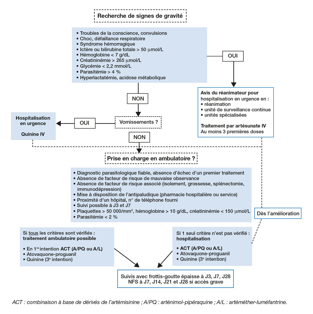 Une confirmation biologique (avec rendu du résultat) est indispensable dans les plus brefs délais. Une fois le diagnostic posé (contact direct entre prescripteur et biologiste), le traitement doit être initié immédiatement. L’hospitalisation n’est pas indispensable mais recommandée (aggravation brutale possible). Cependant, des critères de prise en charge en ambulatoire sont proposés dans les recommandations, le bon sens voulant que le prescripteur s’assure de la disponibilité de l’antipaludique dans la pharmacie de proximité.